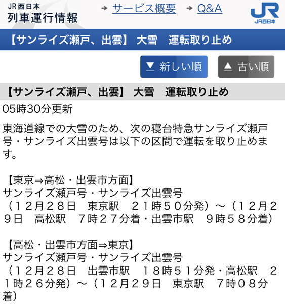 往路は大雪のため予約していた寝台特急サンライズは運休・・・
